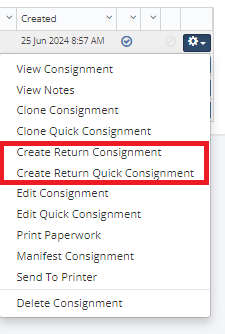 Once the consignment has been made the paperwork can be printed as pdf. Click on the consignment options and select "Print Paperwork" from the drop down.